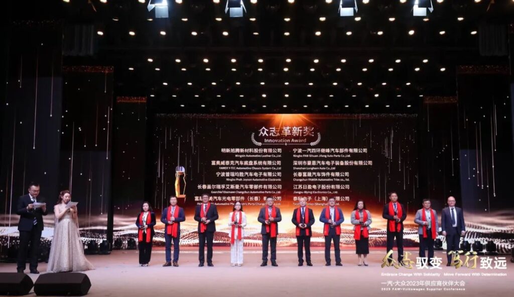On March 21, 2023, Mingxin Xuteng won the “Unity Innovation Award” at the 2023 FAW-Volkswagen “Unity to Control Change, Dedicated to Go Far” Supplier Partner Conference. According to reports, every year, FAW-Volkswagen selects excellent suppliers from many industry-leading suppliers to commend them for their pursuit of high quality, excellent execution, and ability to innovate in technology and control costs. Relying on its cutting-edge technology research and development strength and independent innovation capabilities, Mingxin Xuteng has widely applied the cutting-edge technologies of new automotive interior materials such as chrome-free tanning, full vegetable tanning, and full water-based microfiber while maintaining its leading technology in leather. In terms of product production, it has produced a series of new automotive interior materials that meet the safety and environmental protection requirements of FAW-Volkswagen and are comfortable and beautiful, and were commended. Deputy General Manager Ms. Shen Dan accepted the award on behalf of the company and was invited to participate in the FAW-Volkswagen supply chain co-creation brand launch ceremony.
